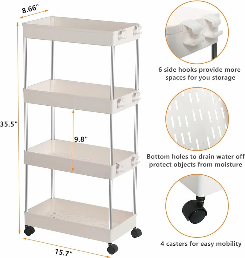 • 4-Tier Cart for Anywhere: The 4-tier slim storage cart is 8.6inch in width which can be used in tight spaces in your home for storage. Suitable for closets, kitchens, bathrooms, garages, laundry rooms, offices, or in-between your washer and dryer