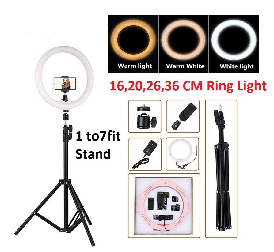 - High Brightness 36cm Ring Light: 36cm Selfie Ring Light features a rigid set oftraditional mechanical buttons. It provides full control to easily adjust the 3 color modes (cool white, warm yellow and daylight) and brightness levels to meet your different needs. Perfect for Photographers, YouTubers, Vloggers, TikTokers, etc.LED RingLight have Three Different Colours to choose from:The all versatile LED RingLight have Three Different Colours to choose from with different levels of brightness, so now, you can make your TikTok, Vlogs or even take Selfies or Videos with ease and the brightness and colour of your own choice.Versatile and Portable 7ft Tripod Stand:The 7ft Tripod stand can freely combine to a Selfie RingLight, Selfie Stick, Phone and Camera Tripod, extendable Tripod Length Between 2 to 7 feet.Universal Metal Phone Holder:The Universal Metal Phone Holder is strong as it is made of metal, it can bend at any angle and hold your phone steadily, the grip of Universal Metal Phone Holder is so tight that your phone will never fall off of Mobile Holder.USB Powered LED Ring Light:The 36cm Ring Light is USB powered, so you don't have to worry to find a wall socket as it works with almost all the USB Charger, Powerbank, laptop etc.